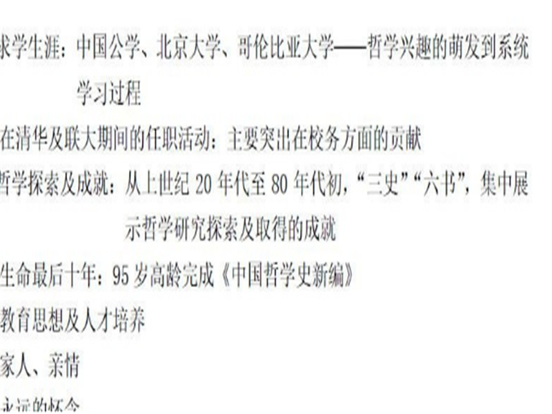 教育家──为清华大学发展(文学院院长、哲学系主任、校务会议重要参与者)、人才培养作出杰出贡献(教育思想、哲学人才培养) 根据定位,大致划分为求学、任教、哲学成就、家庭等几个主题。因为承担的社会角色多,所以逻辑线索通过纵向的时间顺序与横向的不同方面相结合来安排不同主题: