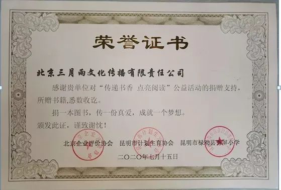 9月10日,三月雨集团收到北京企业评价协会、昆明市计划生育协会、昆明市禄劝县秀屏小学联合颁发的荣誉证书,表达他们对三月雨爱心行为的由衷敬意和衷心感谢。