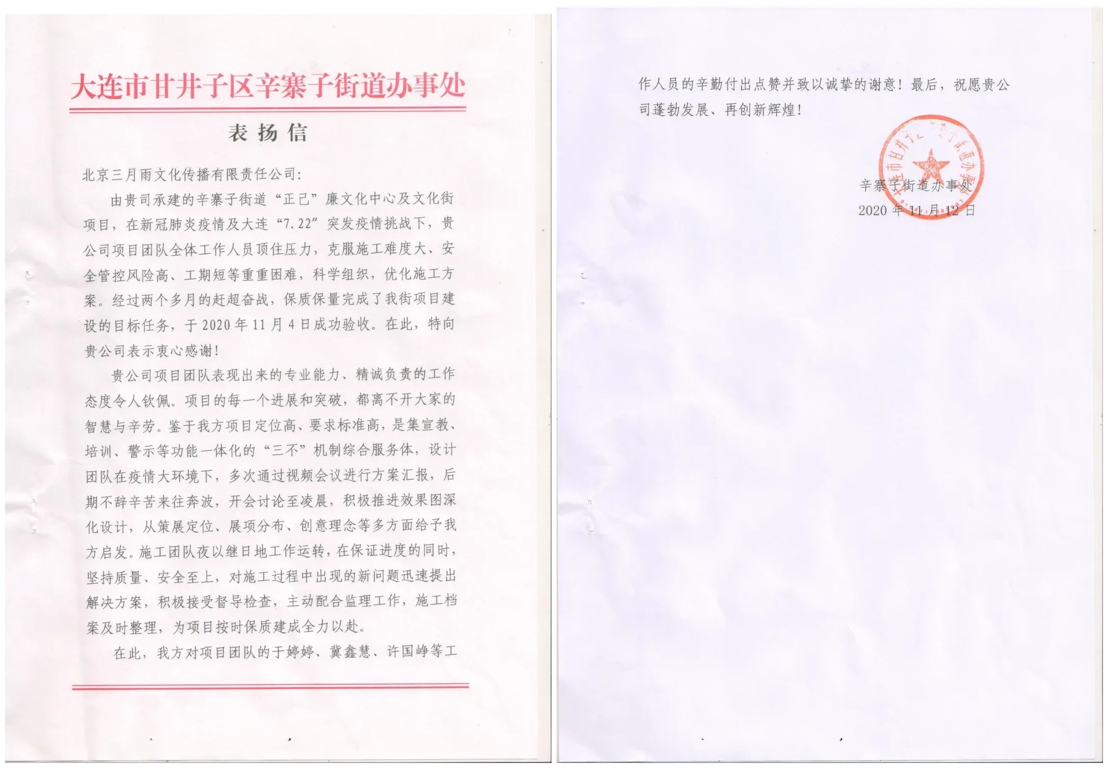 喜讯!三月雨收到大连市辛寨子街道表扬信