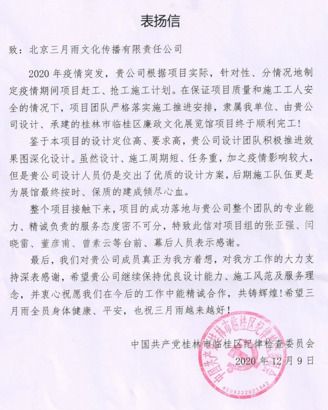 近日,三月雨集团办公室收到一封来自桂林市临桂区纪委的表扬信,信中对三月雨项目团队在设计、承建的桂林市临桂区廉政文化展览馆项目中展现出的专业能力和服务态度,表达了高度的认可和由衷的谢意。