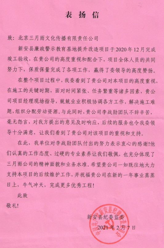 2021年2月7日,三月雨集团收到了一封来自新安县纪委监委的表扬信,对三月雨项目团队在建设新安县廉政警示教育基地过程中,认真的工作态度、过硬的专业素养,兢兢业业积极协调、解决施工难题,给予了高度的赞扬。