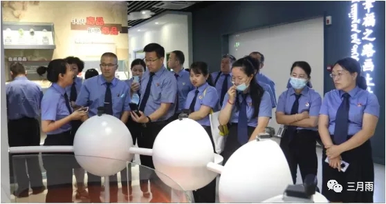 在由三月雨设计建设的东胜区青少年法治教育实践基地,调研组先后参观了以“守护娜荷芽”为创意主旨的序厅、拥有270度沉浸式环幕的5D影院及以“雏鹰折翼 深刻警醒” “学法立行 守法做人” “青春护航 快乐成长” “洋溢青春 做好少年”为主题的不同展区,观看了影片《逐梦·守护娜荷芽》,参与了警示教育、远离毒品、测试答题等相关互动。
