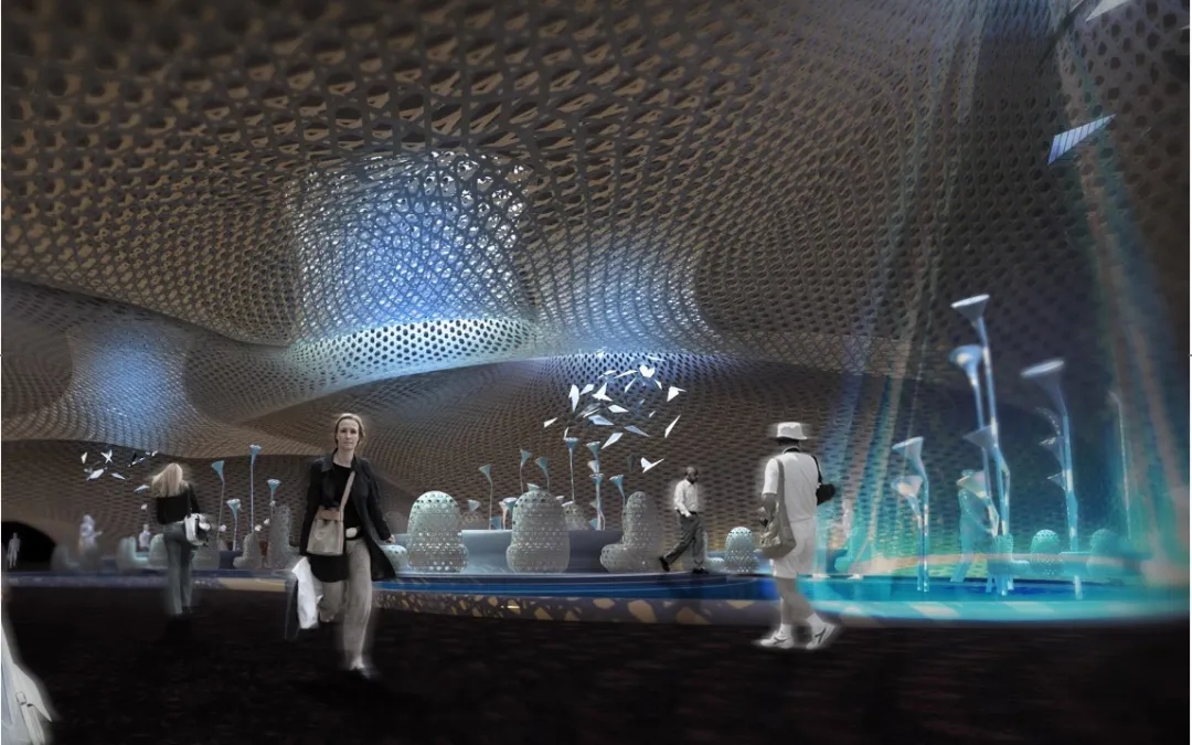 灯光、色彩、虚拟投影等的充分运用可以呈现给参观者更加丰富的视觉、听觉效果。多媒体可以展现一些奇异的场景以满足人们的好奇心,充分地体现创意设计。2015年米兰世博会中国馆就是运用了仿麦穗的LED灯,通过技术的控制形成各种各样的图案。