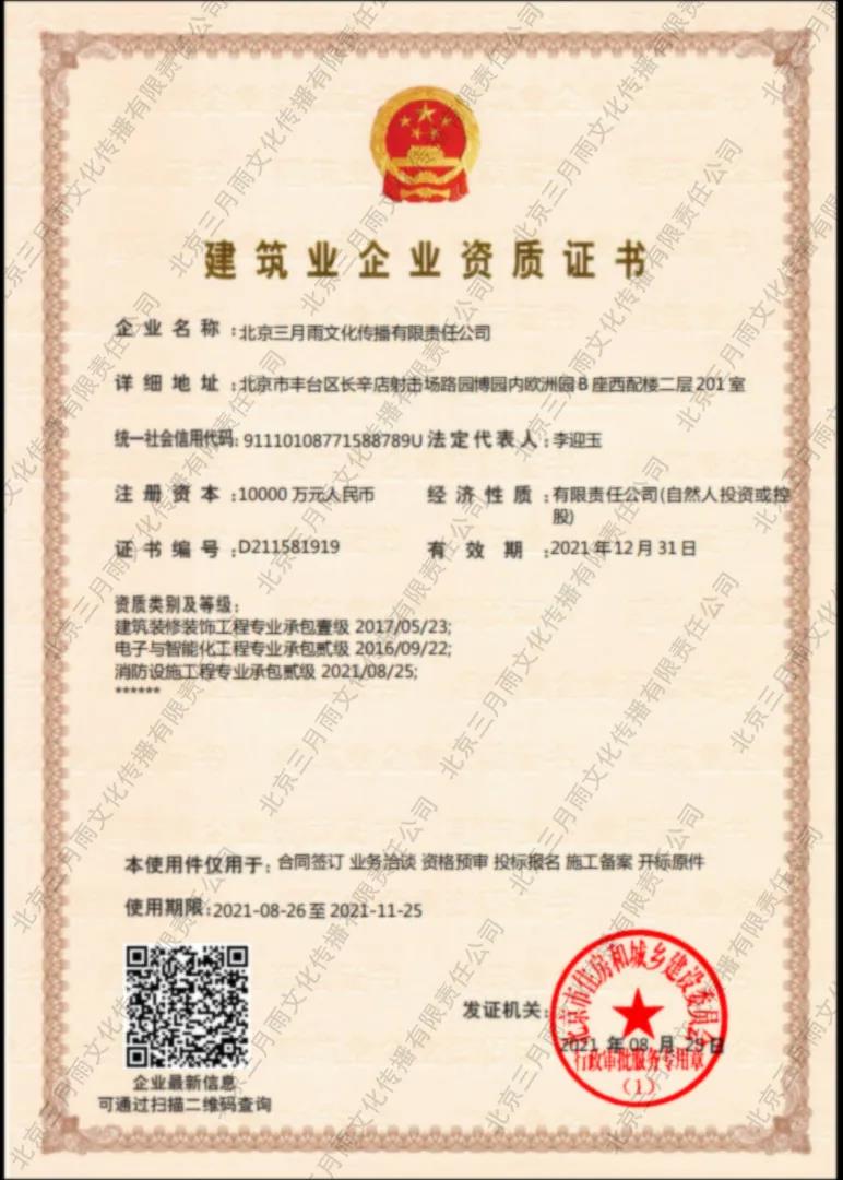三月雨经过不断学习提升,具备了可承担建筑面积不大于4万平方米的民用建筑、火灾危险性为丙类及以下的厂房和库房的消防设施工程的资格,成功将消防设施工程专业承包二级资质“收入囊中”。此次该资质的成功获得,将与建筑装修装饰工程专业承包一级、电子与智能化工程专业承包二级等资质形成优势互补,提高集团业务的承揽能力,进一步提升三月雨在展览建筑工程中的综合竞争力。