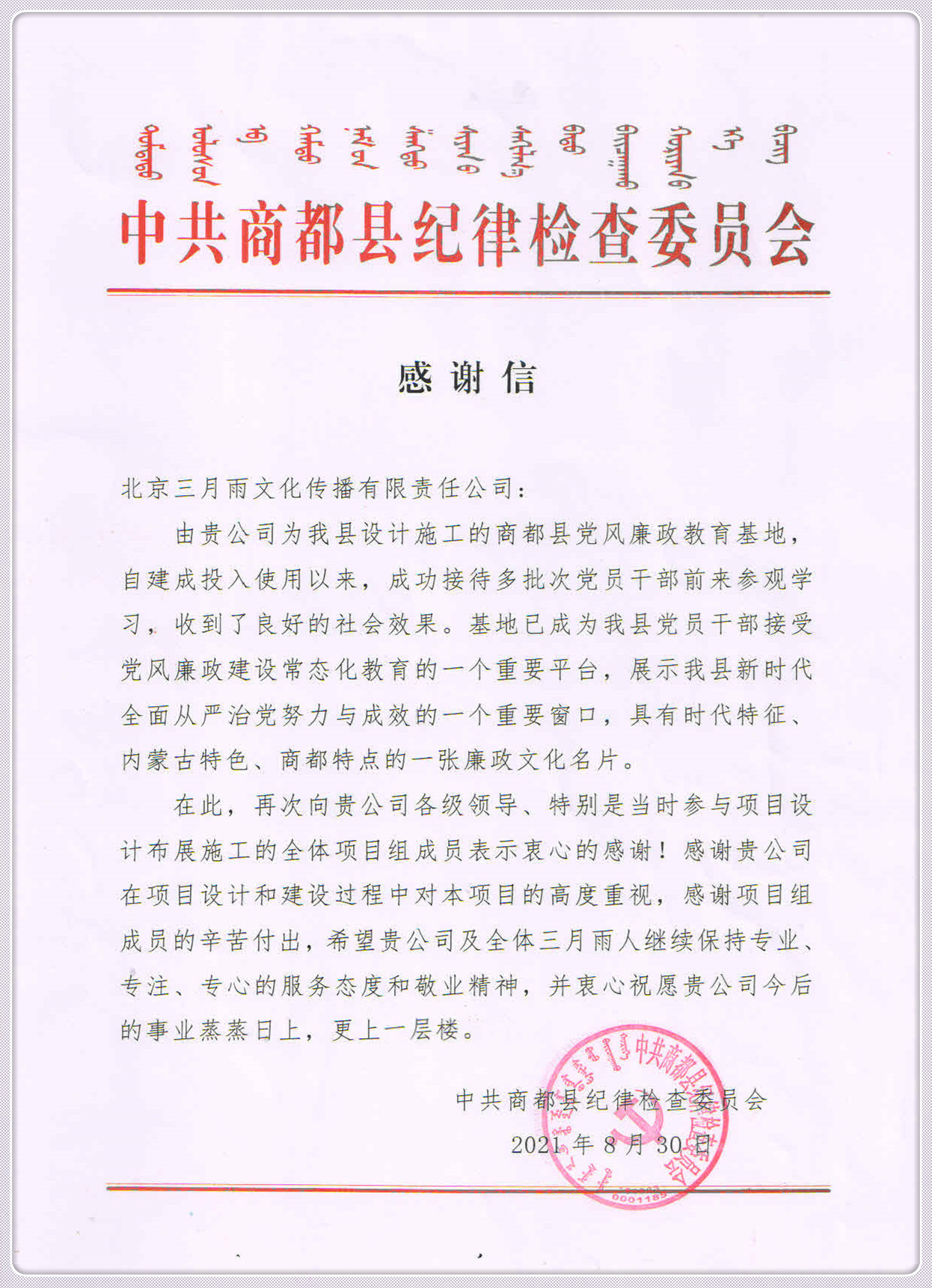 近日,三月雨集团办公室收到一封充满温度的感谢信,这封来自内蒙古商都县纪律检查委员会的感谢信,字里行间表达了对三月雨项目团队浓浓的感谢之情与赞赏之意。