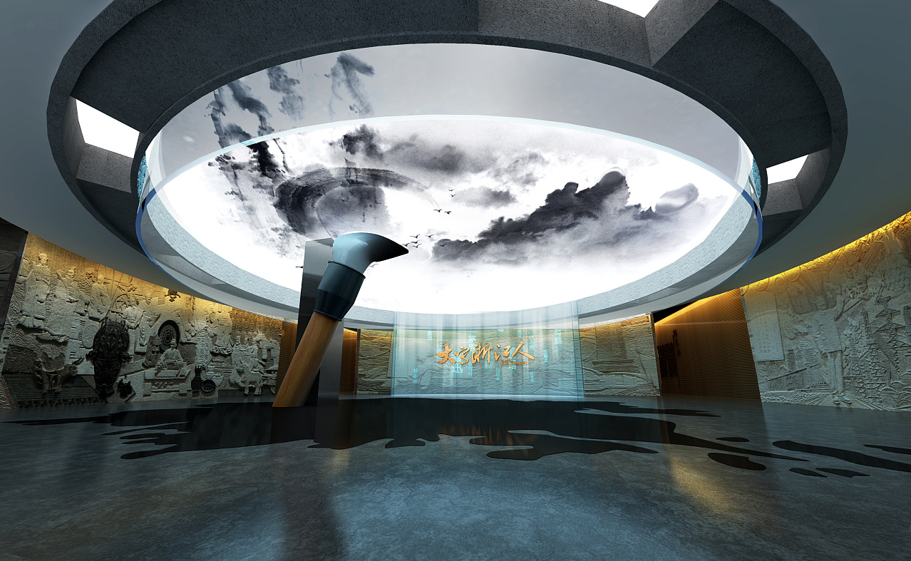 该展馆通过毛笔艺术造型与顶面水墨软膜天花相结合,诗意般的设计表达,描绘浙江历史画卷,主题墙以数字瀑布的形式加墙面浅浮雕,展示本地从古至今各领域的杰出人物代表。