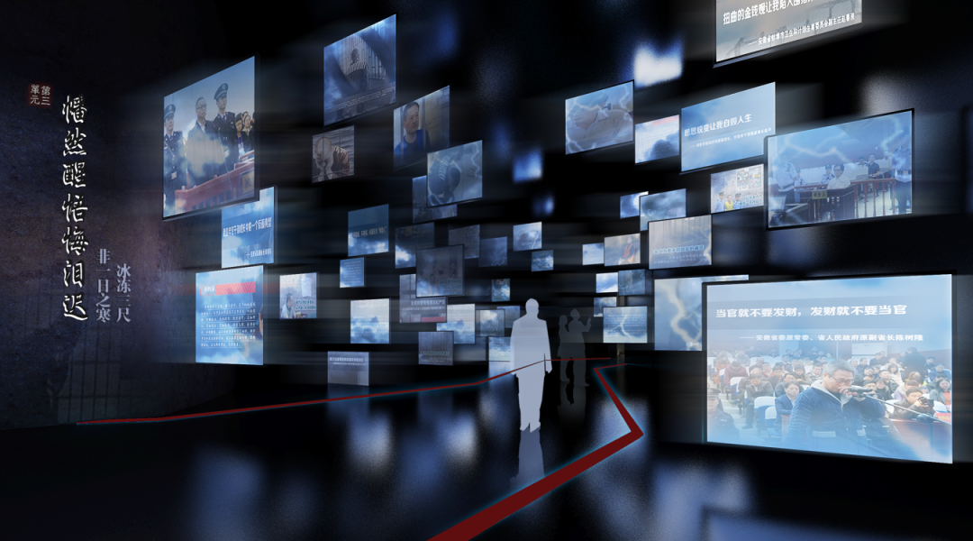 错落的组合流媒体,展示落马官员的忏悔,打破以往监狱、囚室等同质化的忏悔表现形式,流媒体渐次播放案件当事人的忏悔,近在咫尺的画面带来零距离的震撼,构建出一个无限延伸的情感触动空间。