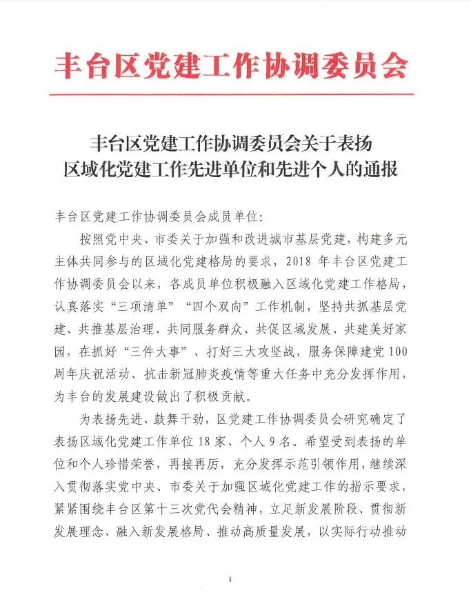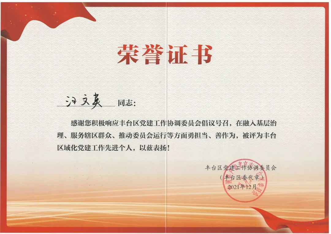 近日,三月雨集团工会主席汪文英获北京市丰台区党建工作协调委员会通报表扬,被评为“丰台区域化党建工作先进个人”。